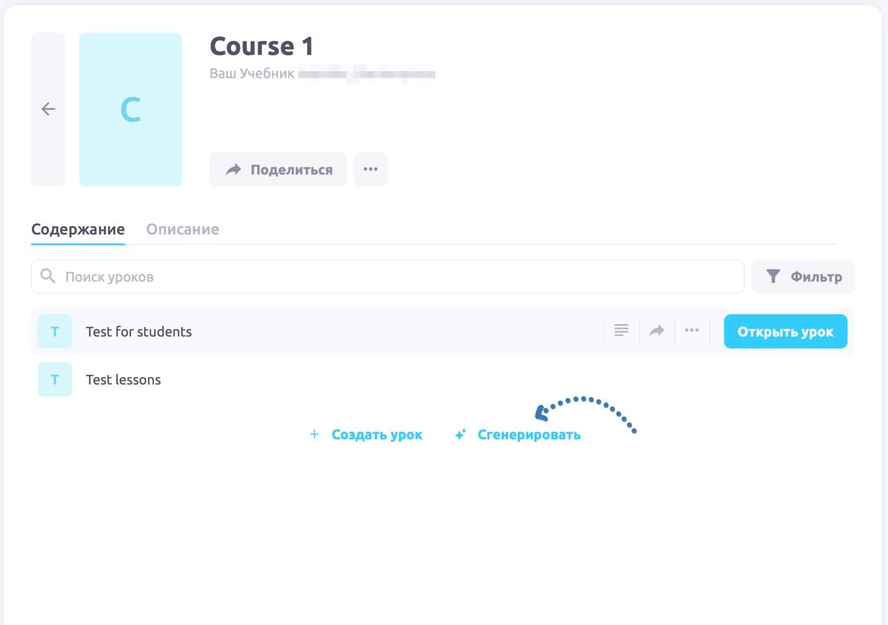 В разделе «Материалы» → «Личные» создайте новый курс или откройте уже существующий. Когда курс открыт, обратите внимание на кнопку «Сгенерировать»
