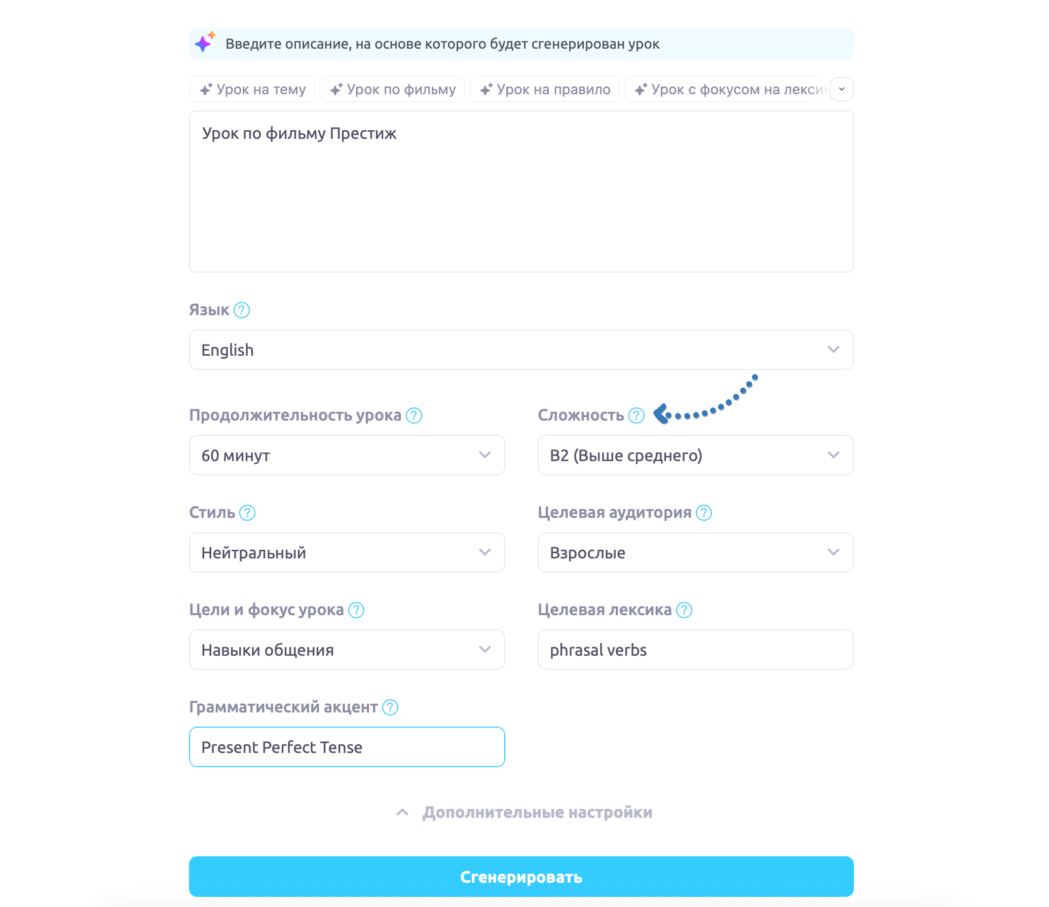 В этом блоке уточните желаемую продолжительность, уровень сложности, цели, фокус и другие параметры урока.