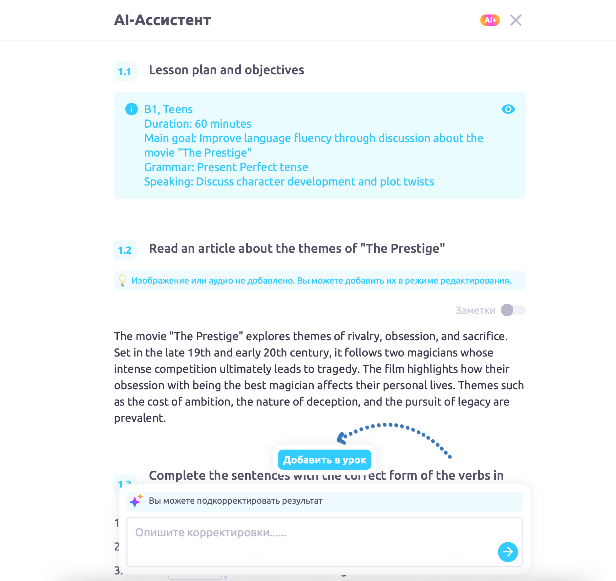 — Учитывает заданную вами тему, уровень, продолжительность урока, стиль, цели урока, а также ключевую лексику и грамматический фокус
