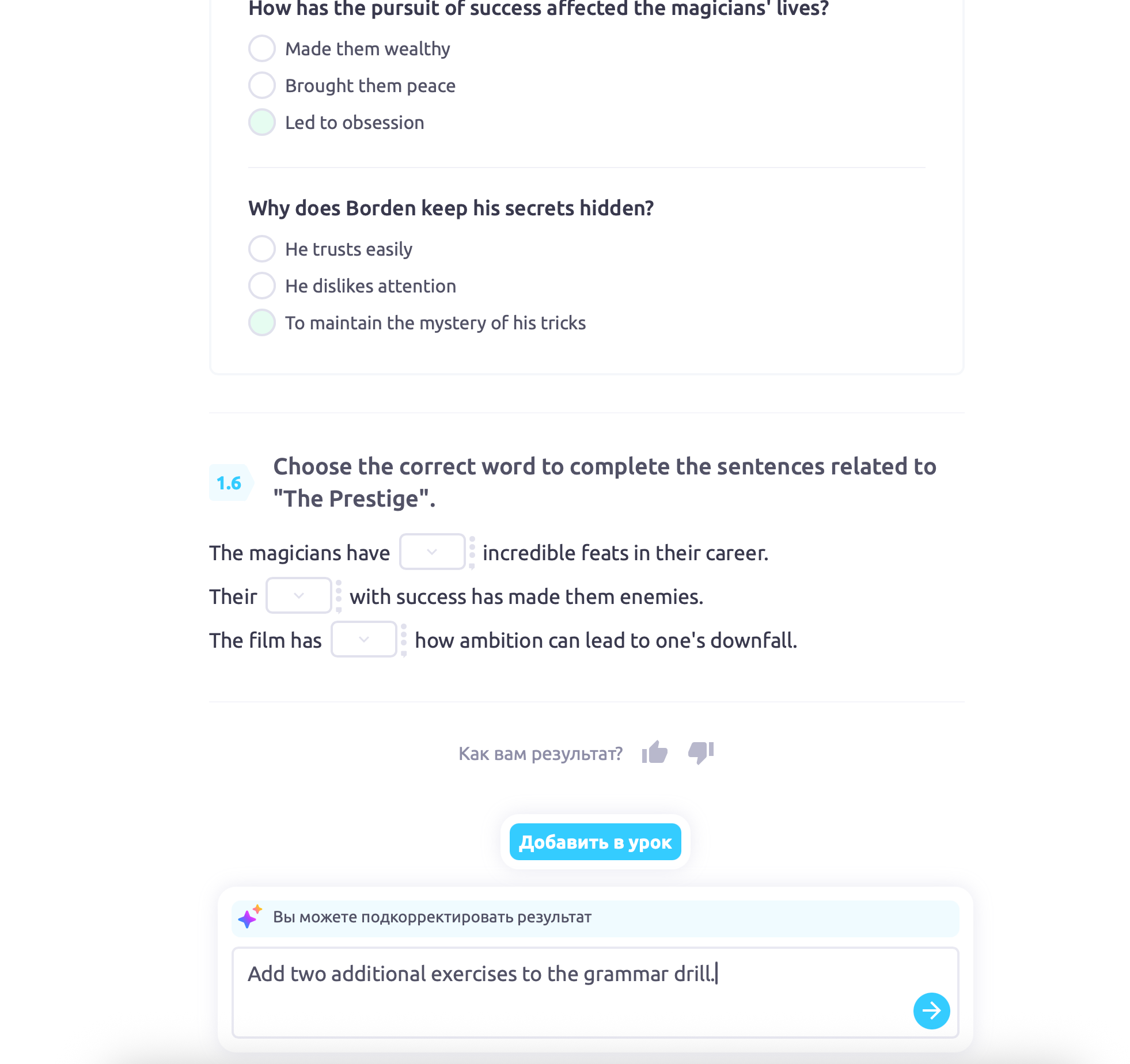 После завершения генерации и если результат вас устраивает, можете сразу добавить упражнения в урок — для этого нажмите кнопку «Добавить в урок».