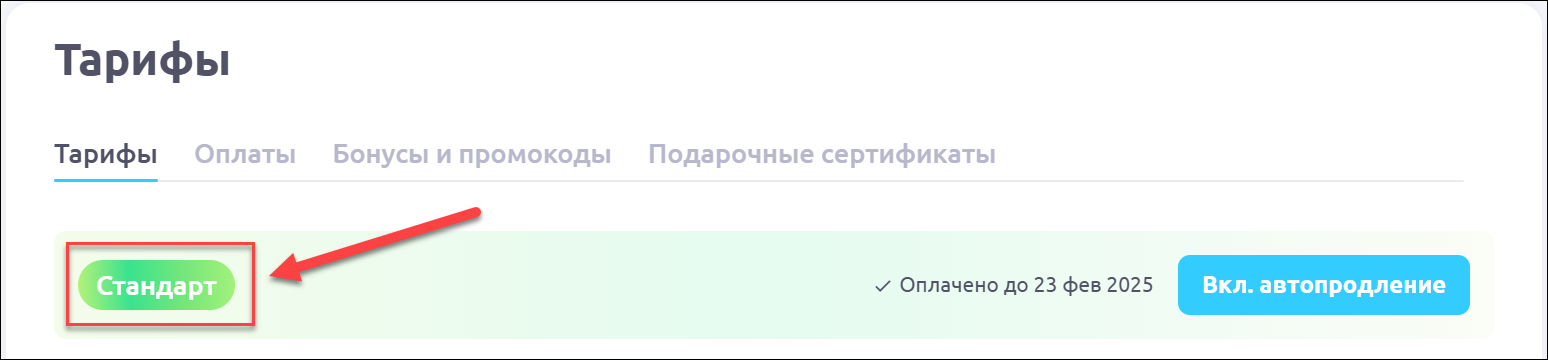 В этом блоке вы видите ваш текущий тариф, дату окончания подписки на данный продукт и можете включить автопродление оплаты тарифа.