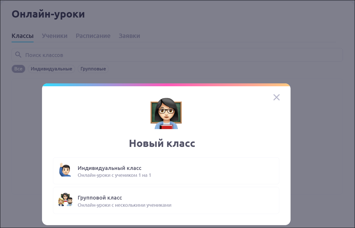 Сразу после регистрации вы переходите на главную страницу вашего профиля. По умолчанию это страница Онлайн-уроки, вкладка Классы.