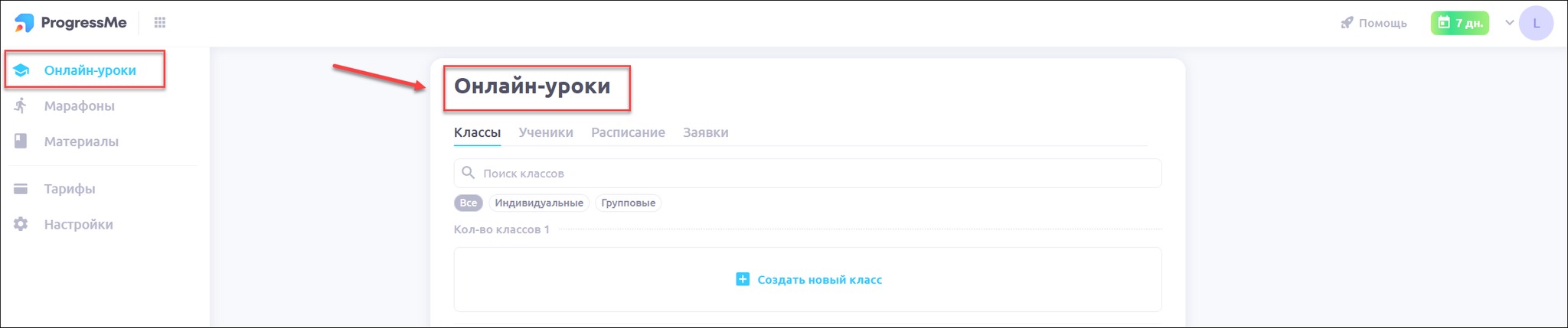 При входе в аккаунт у вас автоматически открывается раздел Онлайн-уроки, вкладка Классы: