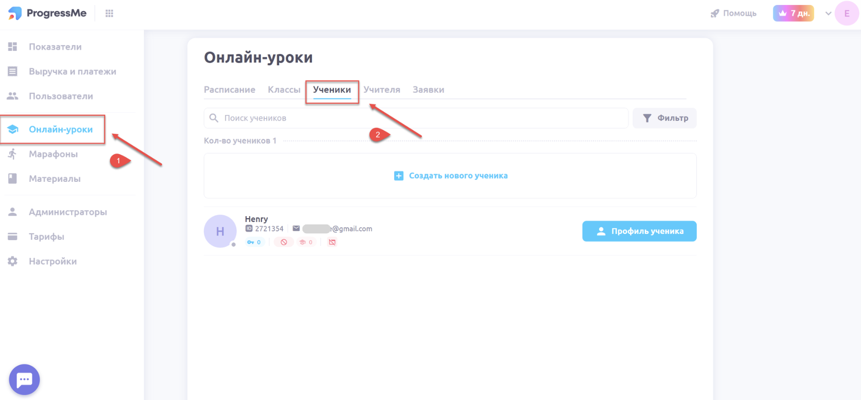 Нажмите на вкладку Профиль ученика: