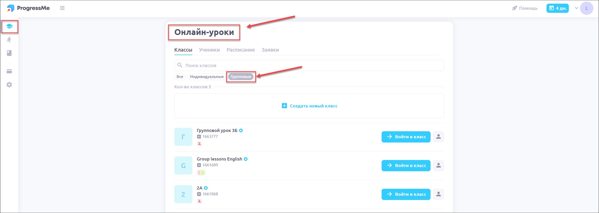 Откройте раздел Онлайн-уроки и при необходимости отфильтруйте список классов по типу Групповой: