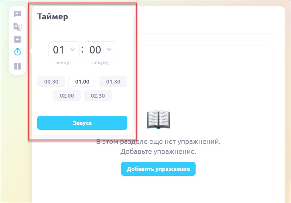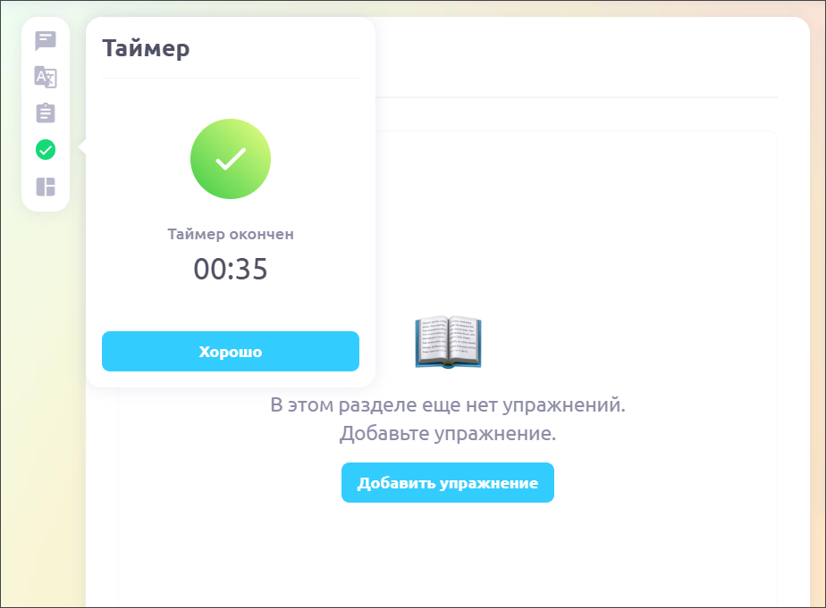 Он может понадобиться для экзаменационных активностей или выполнения заданий на время. С функциональной точки зрения ученик ничем не ограничен на время запуска таймера, для него он носит скорее информационную функцию.