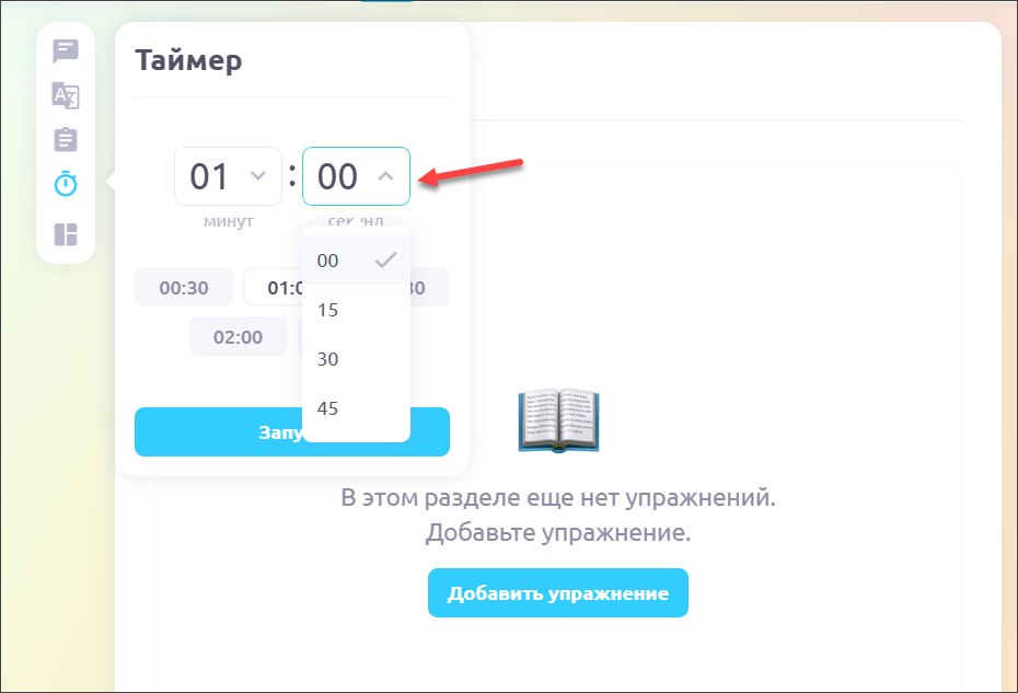 Так же можно сделать и с секундами, выбрав нужное значение в интервале от 0 до 45: