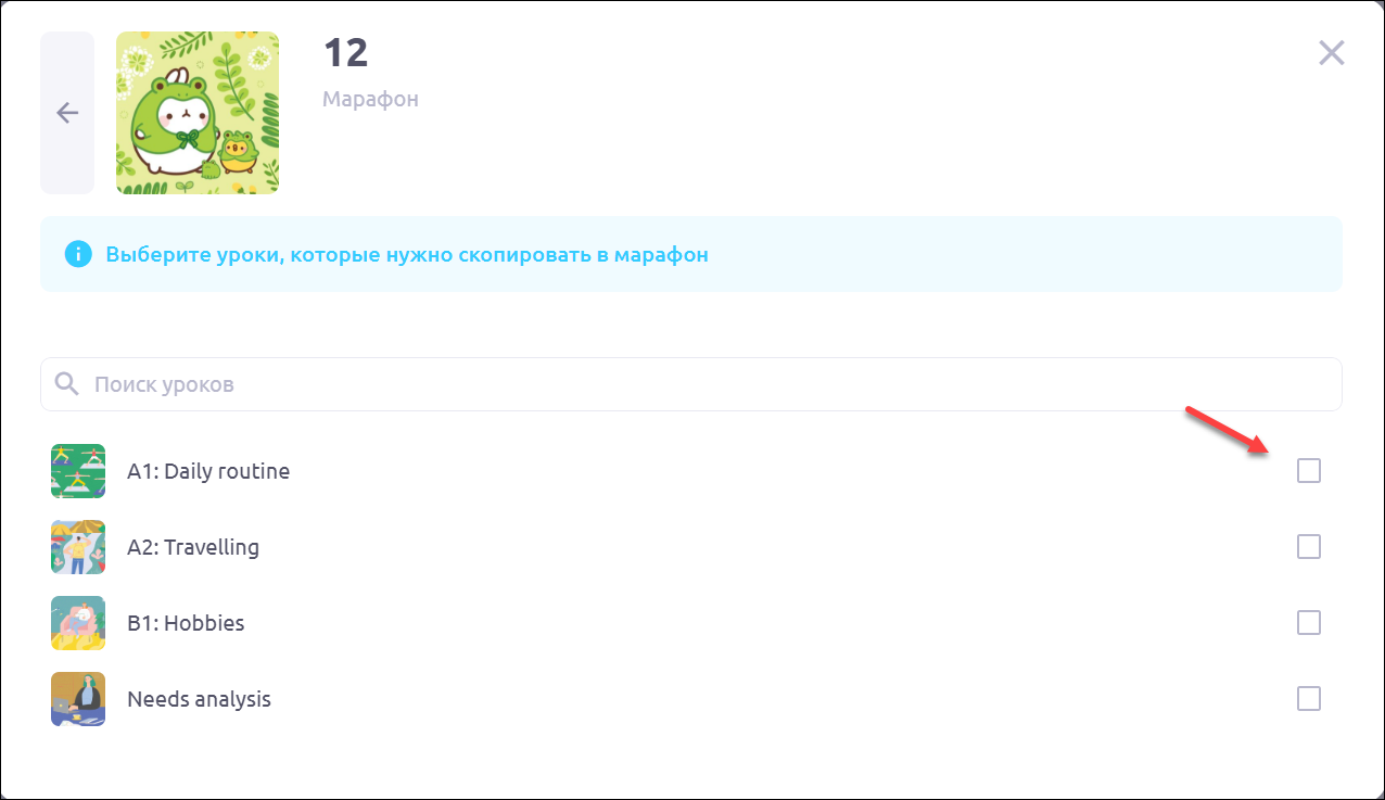 Проставьте галочку напротив урока, который хотите скопировать: