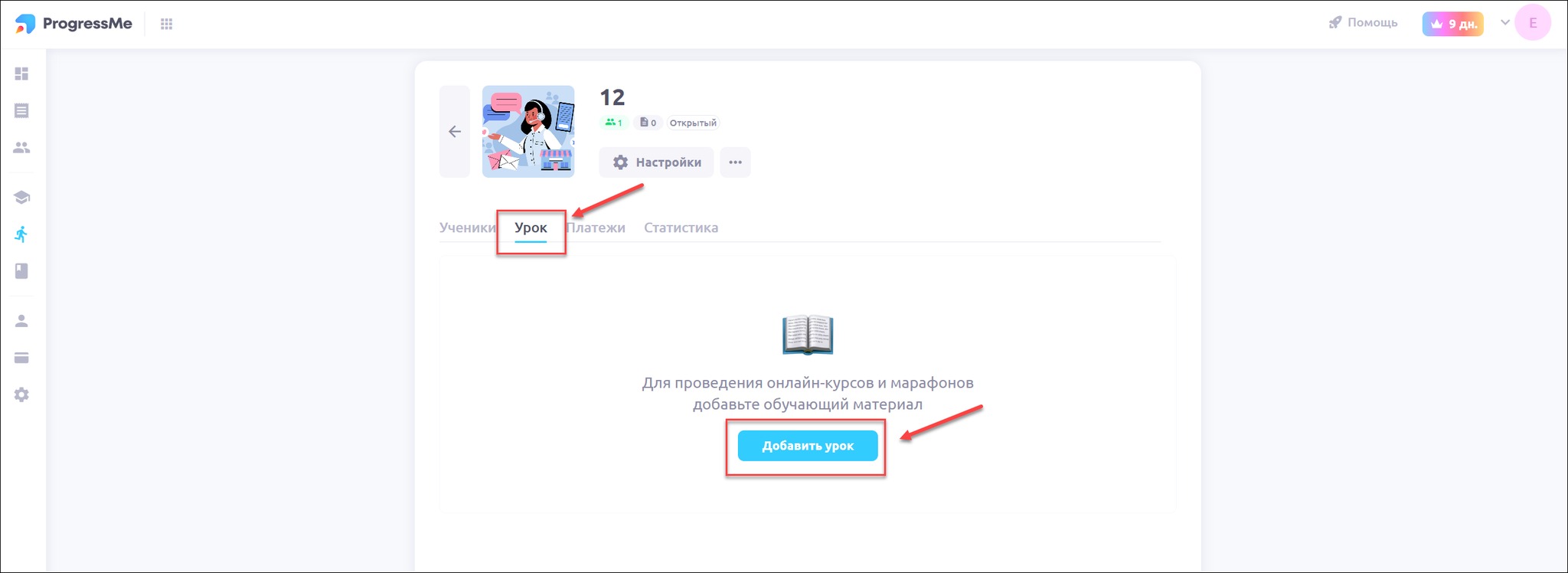 Откройте вкладку Урок и нажмите Добавить урок: