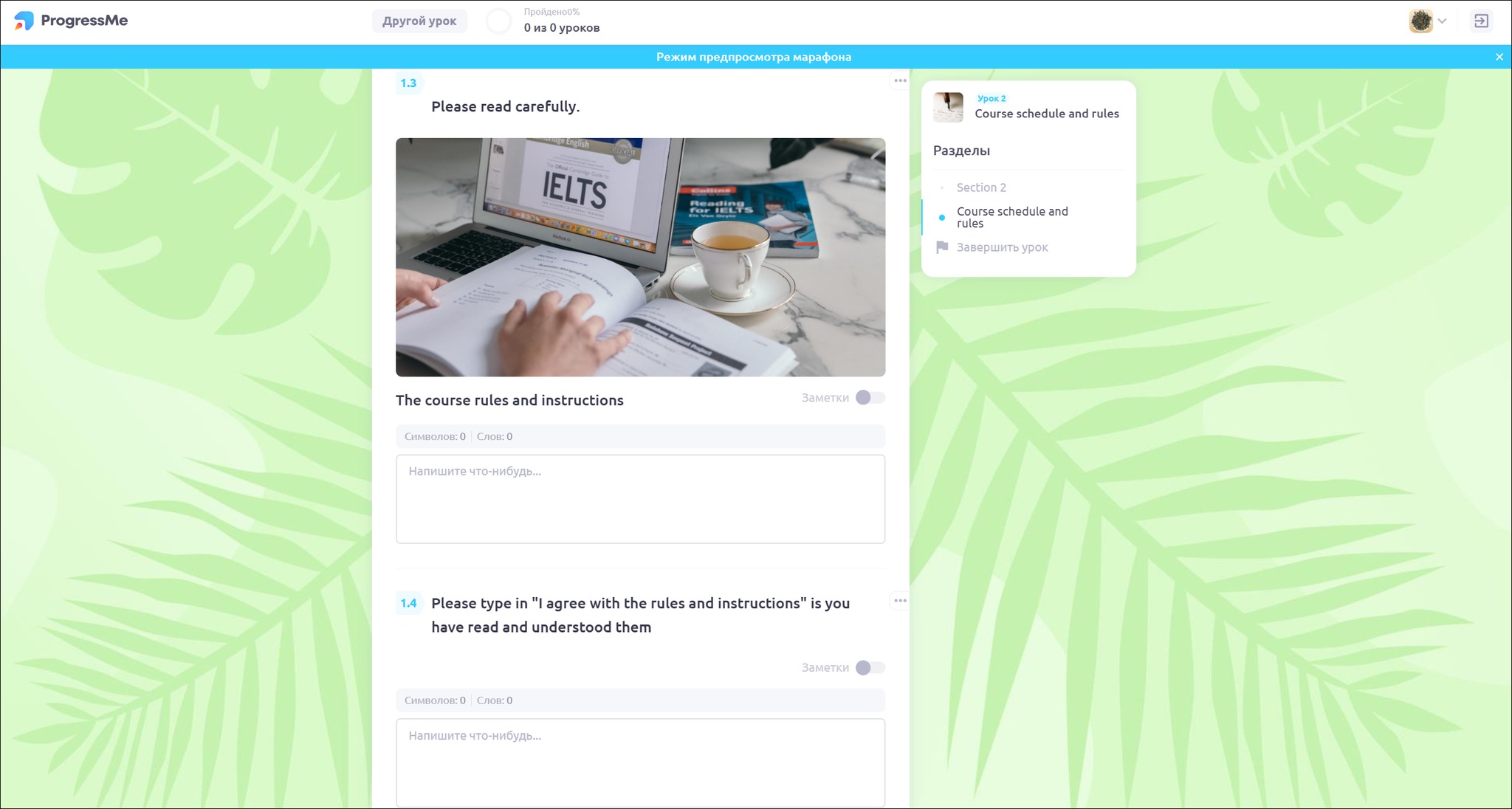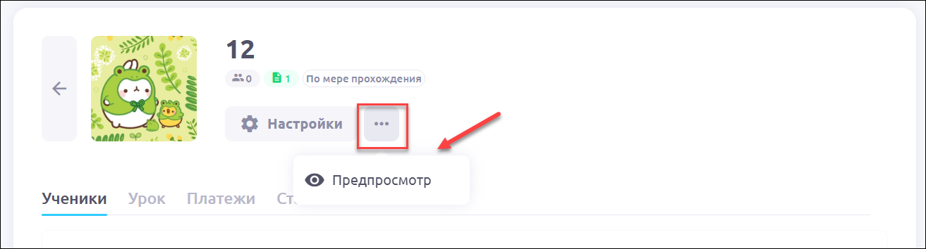 У марафона есть меню предпросмотра, который позволяет увидеть марафон в том виде, в каком его видит ученик. Вы можете посмотреть уроки независимо от того, какой график вы выставили. Просто для вашего представления, как будут выглядеть эти уроки — ознакомительный вариант представления марафона, никакой функциональной нагрузки не несёт: