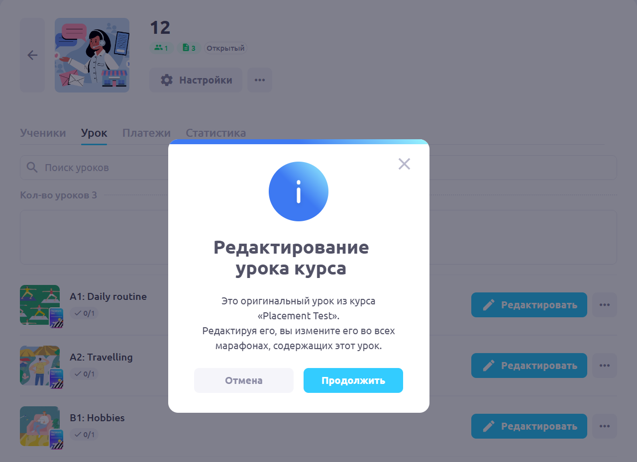 Все изменения, которые внесены в этот урок, будут сохранены только в этой копии. Оригинал при этом остаётся нетронутым — это удобно, если не нужно влиять на другие уроки или марафоны, где используется этот материал.