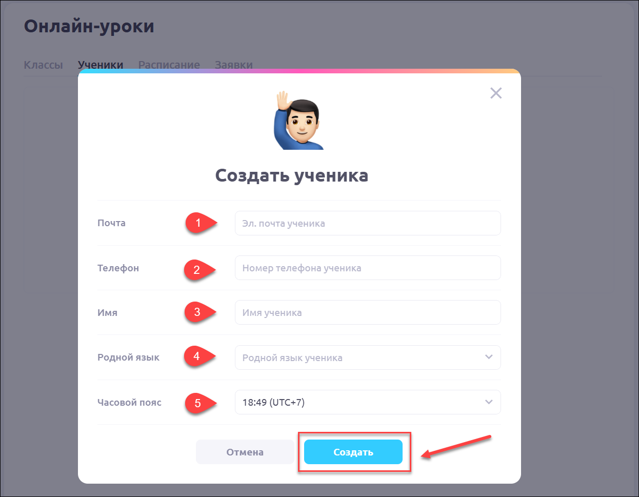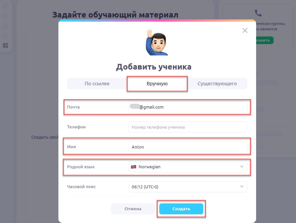 ΠΡΡΡΠ½ΡΡ. ΠΠ»Ρ ΡΡΠΎΠ³ΠΎ Π²Π°ΠΌ Π½ΡΠΆΠ½ΠΎ ΠΎΠ±ΡΠ·Π°ΡΠ΅Π»ΡΠ½ΠΎ ΡΠΊΠ°Π·Π°ΡΡ Π°Π΄ΡΠ΅Ρ ΡΠ»Π΅ΠΊΡΡΠΎΠ½Π½ΠΎΠΉ ΠΏΠΎΡΡΡ, ΠΈΠΌΡ ΠΈ ΡΠΎΠ΄Π½ΠΎΠΉ ΡΠ·ΡΠΊ Π²Π°ΡΠ΅Π³ΠΎ ΡΡΠ΅Π½ΠΈΠΊΠ°, ΠΈ Π½Π°ΠΆΠ°ΡΡ ΠΊΠ½ΠΎΠΏΠΊΡ Π‘ΠΎΠ·Π΄Π°ΡΡ: