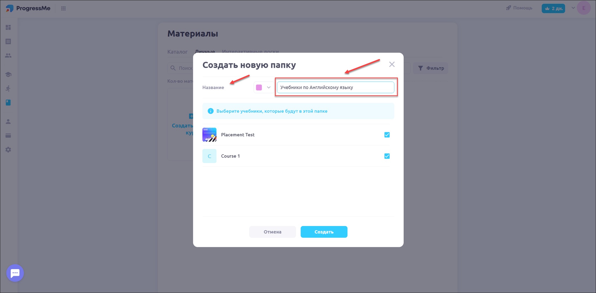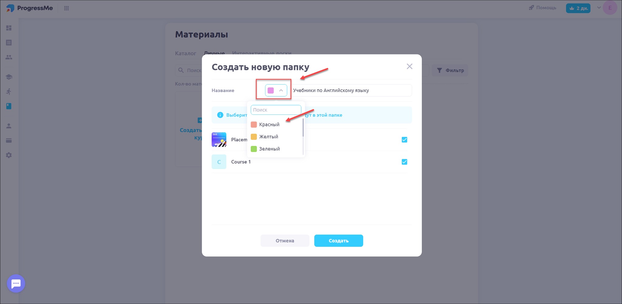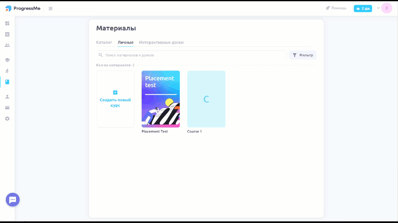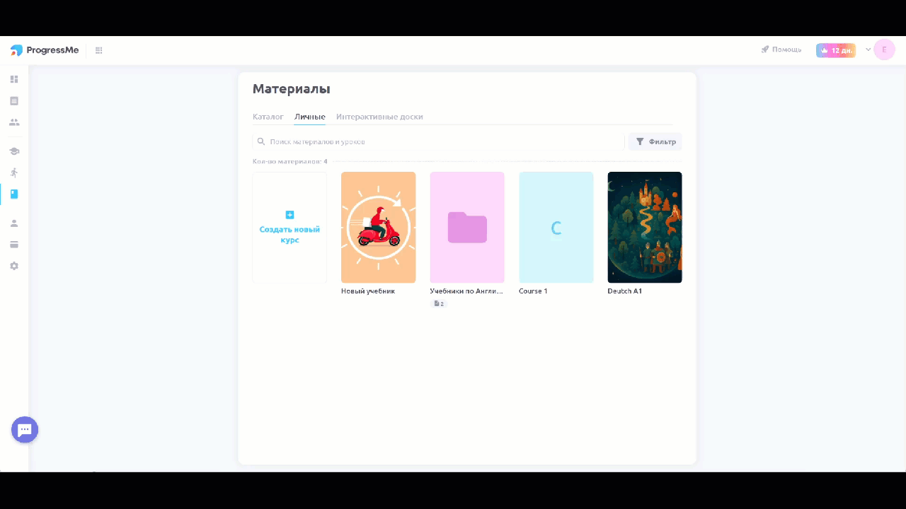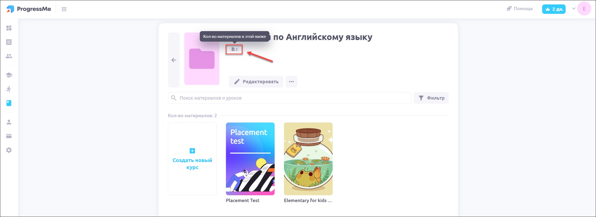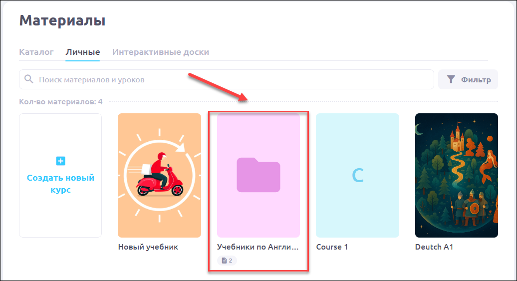 Когда в разделе Материалы собралось много обучающих материалов вы можете распределить их в папки по аналогии с файлами на компьютере. Это функция предназначенная для удобства работы с материалами. Вы можете создавать папки, наполнять их курсами, сортировать папки и материалы в разделе удобным образом, например, по сложности или по алфавиту.
