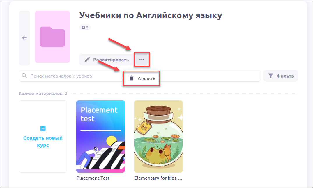 При удалении папки все курсы, которые были в ней, переносятся обратно в общий список личных материалов.