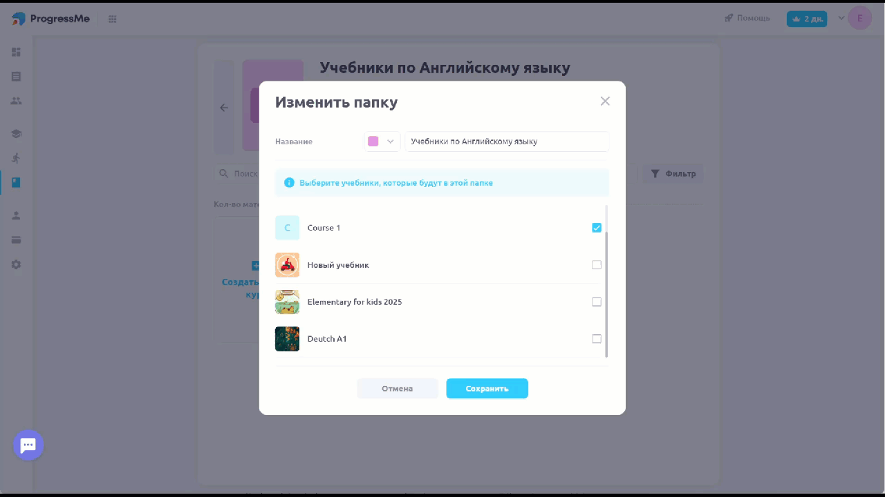 В открывшемся меню поставьте галочку напротив курса, который нужно добавить в эту папку. Нажмите Сохранить: