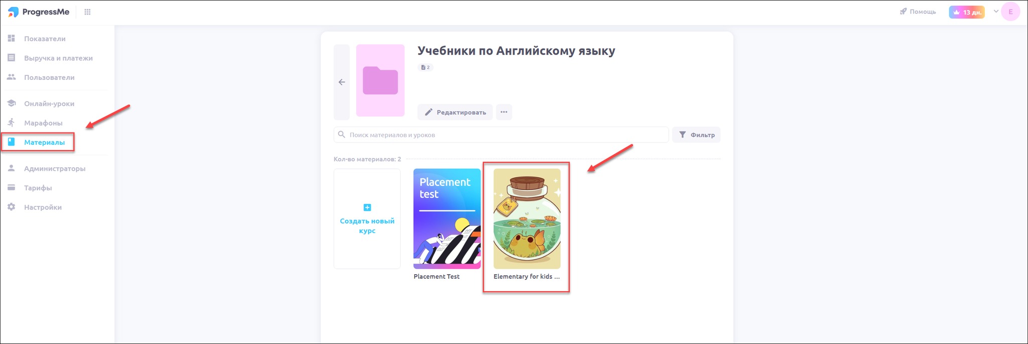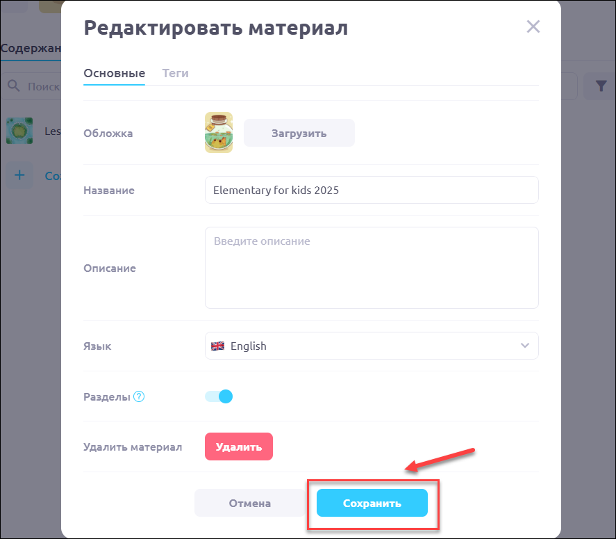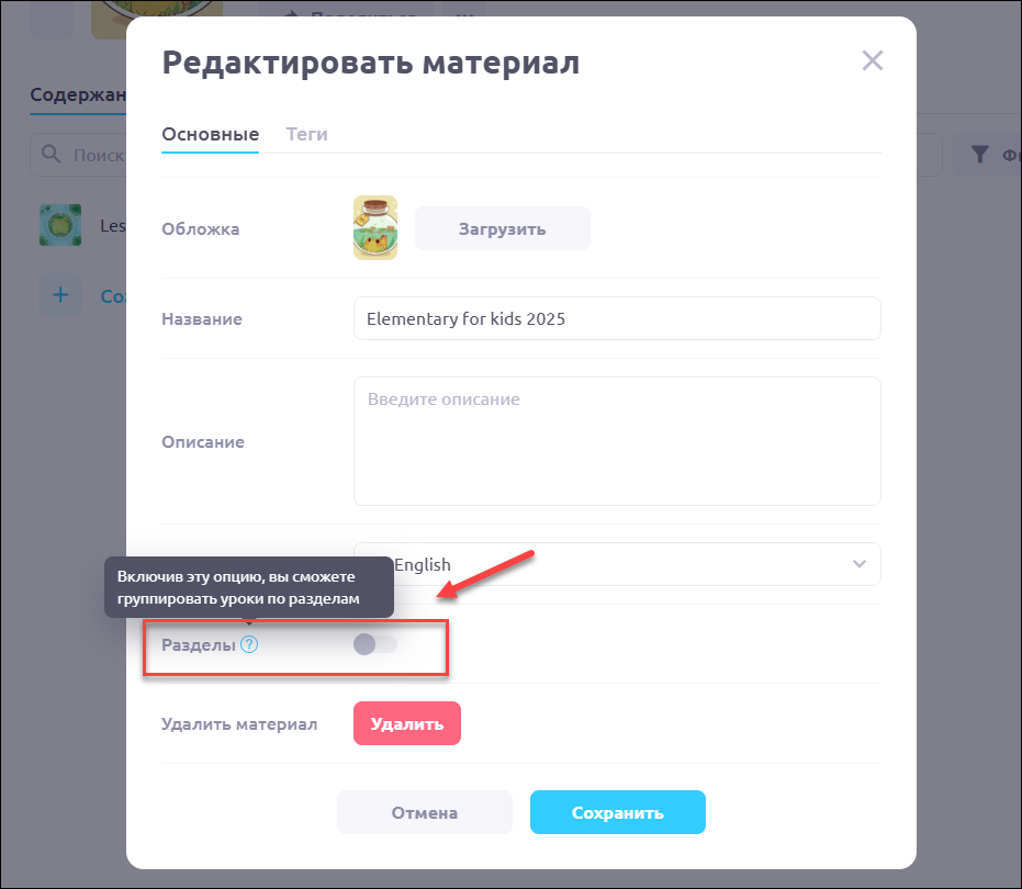 Для создания разделов внутри курса нужно включить опцию Разделы в настройках материала. Чтобы проверить и подключить опцию нужно перейти в раздел Материалы и нажать на обложку учебника, где планируете сделать разделы: