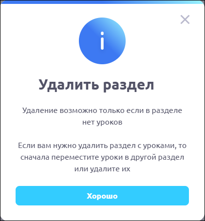 Удаление раздела курса доступно только если в нем нет уроков. При наличии в разделе курса уроков появляется окно с уведомлением:
