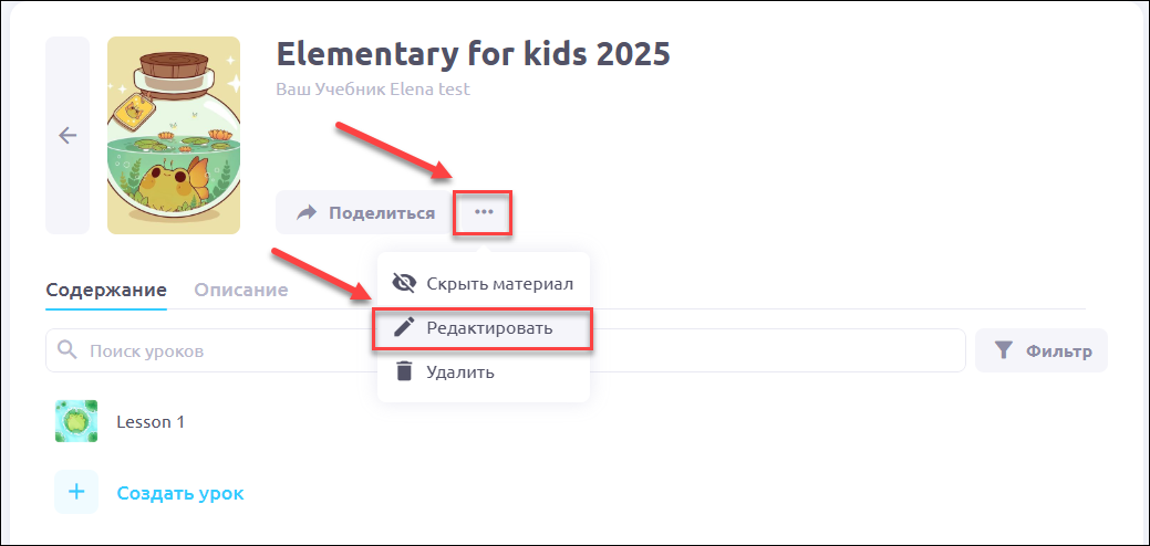 В профиле материала нажмите на три точки для открытия меню и выберите пункт Редактировать: