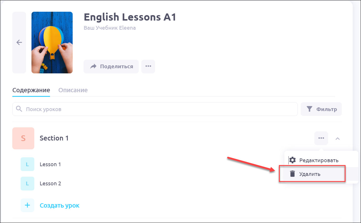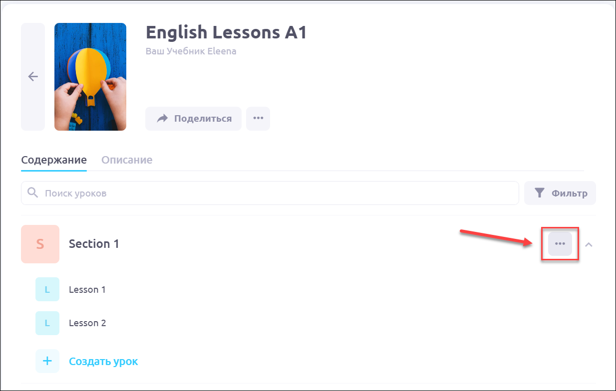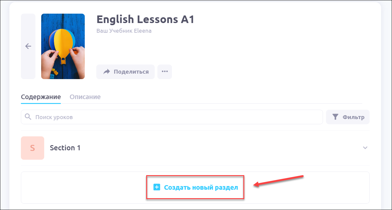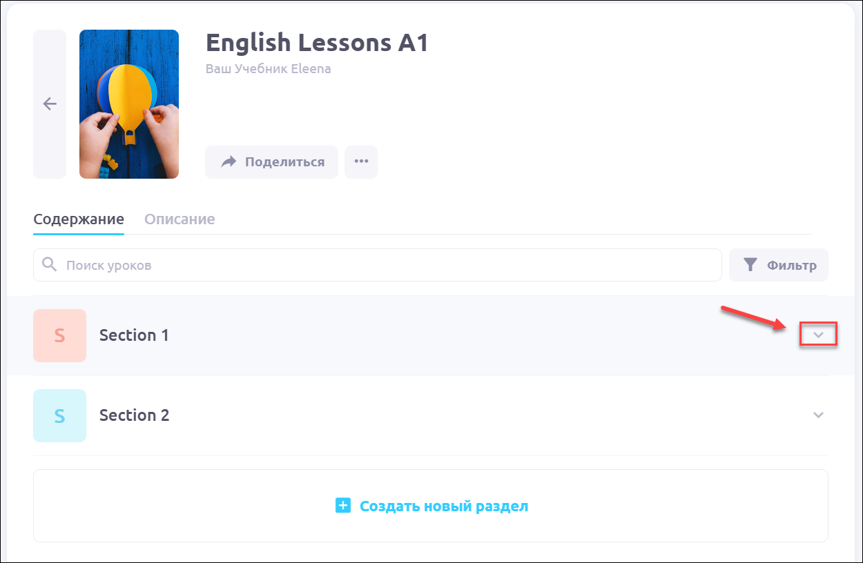 💡 Раздел — контейнер для группы уроков с целью отработки определенной темы или навыка. Например, вы можете разделить ваш курс на разделы Аудирование, Чтение и Грамматика.