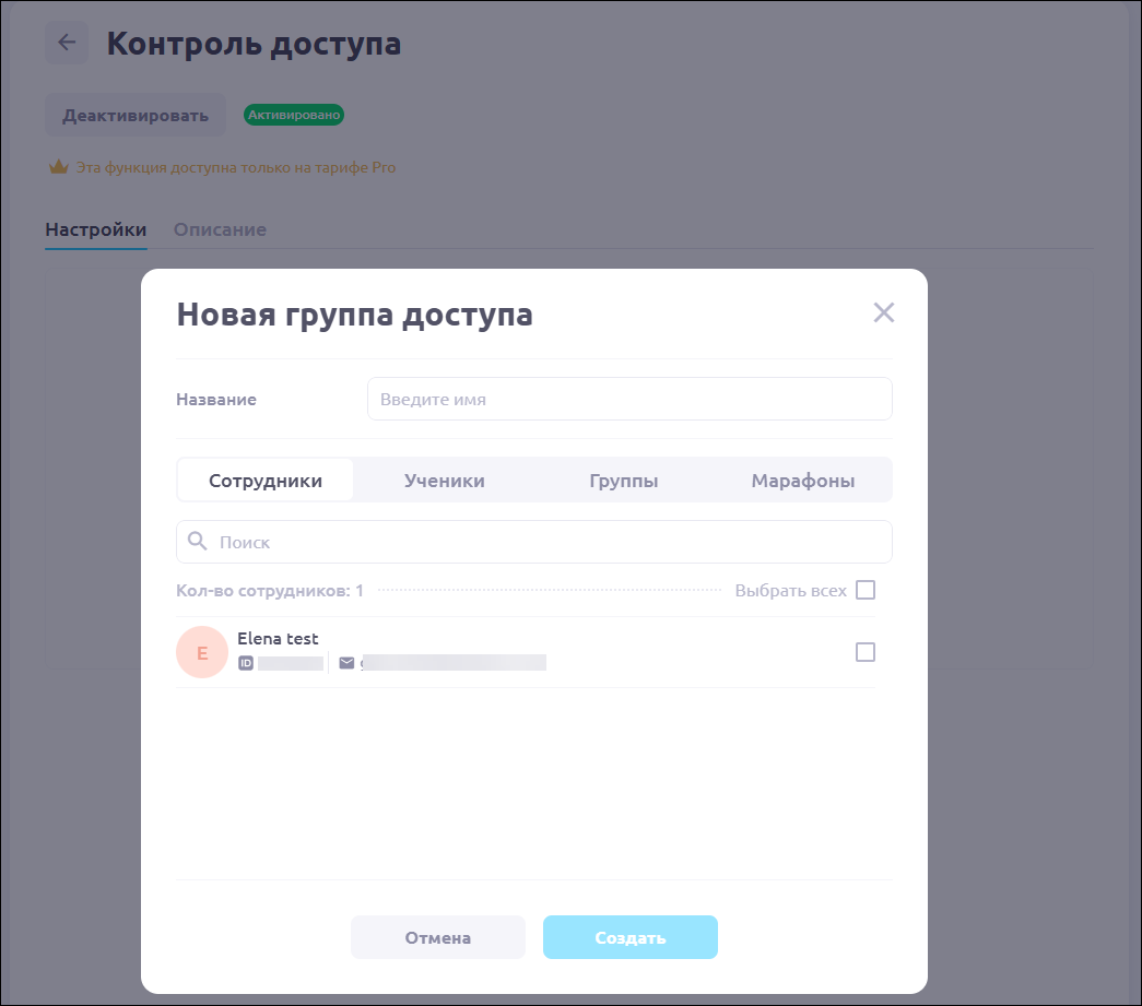При создании группы доступа вы выбираете, кто из сотрудников и учеников входит в неё. Один пользователь может быть участником нескольких групп, но пересечения между группами могут вызвать проблемы с отображением данных: