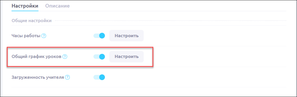 Общий график уроков задаётся в часовом поясе школы и вступает в силу после активации тумблера Общий график уроков:
