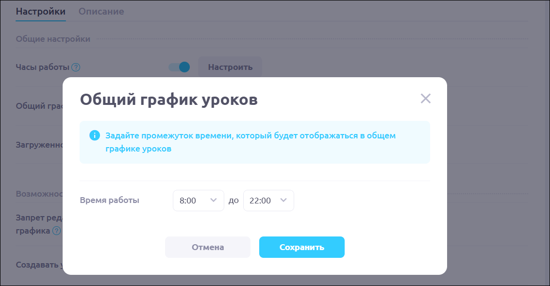 На платформе предусмотрены два уровня настройки графика работы: личные часы преподавателя и общие часы работы школы. Личный график отображается для каждого пользователя с ролью учителя и позволяет задавать индивидуальное расписание. Он особенно актуален, когда в школе работает только один преподаватель.