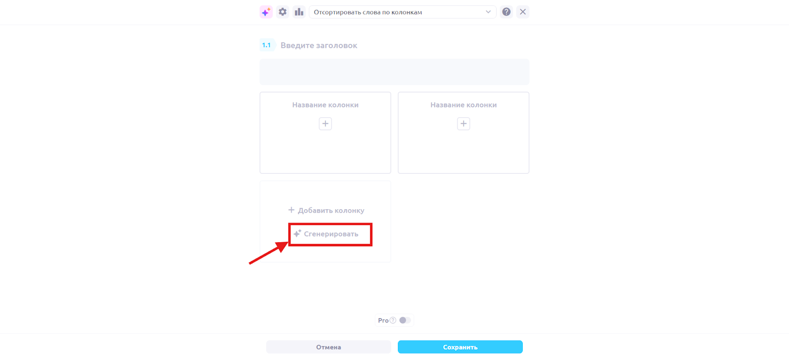 Перейдите в нужный шаблон на платформе, а котором вы хотите создать упражнение. Нажмите на «Сгенерировать».
