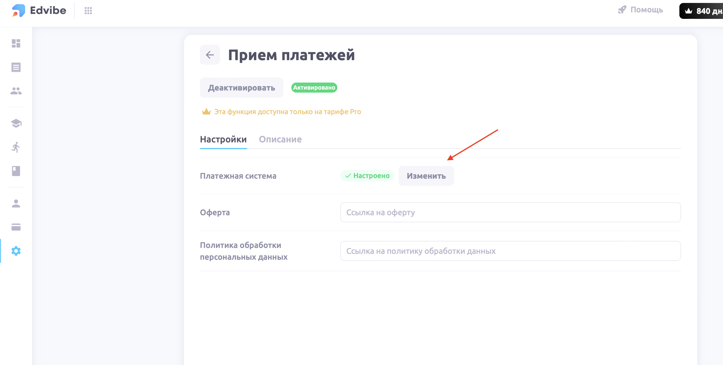 Чтобы включить прием платежей в вашем аккаунте, зайдите в настройки в левом боковом меню и активируйте модуль "Прием платежей"