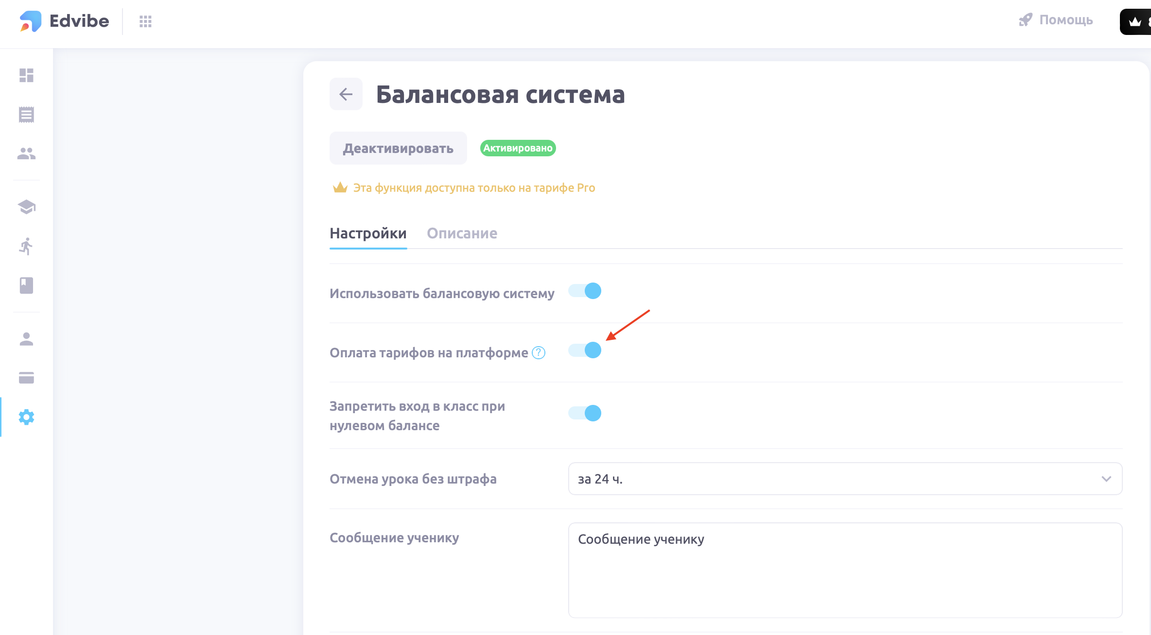 После настройки тарифов и подключения балансовой системы, включите настройку «Оплата тарифов» через платформу в настройках раздела «Балансовая система».