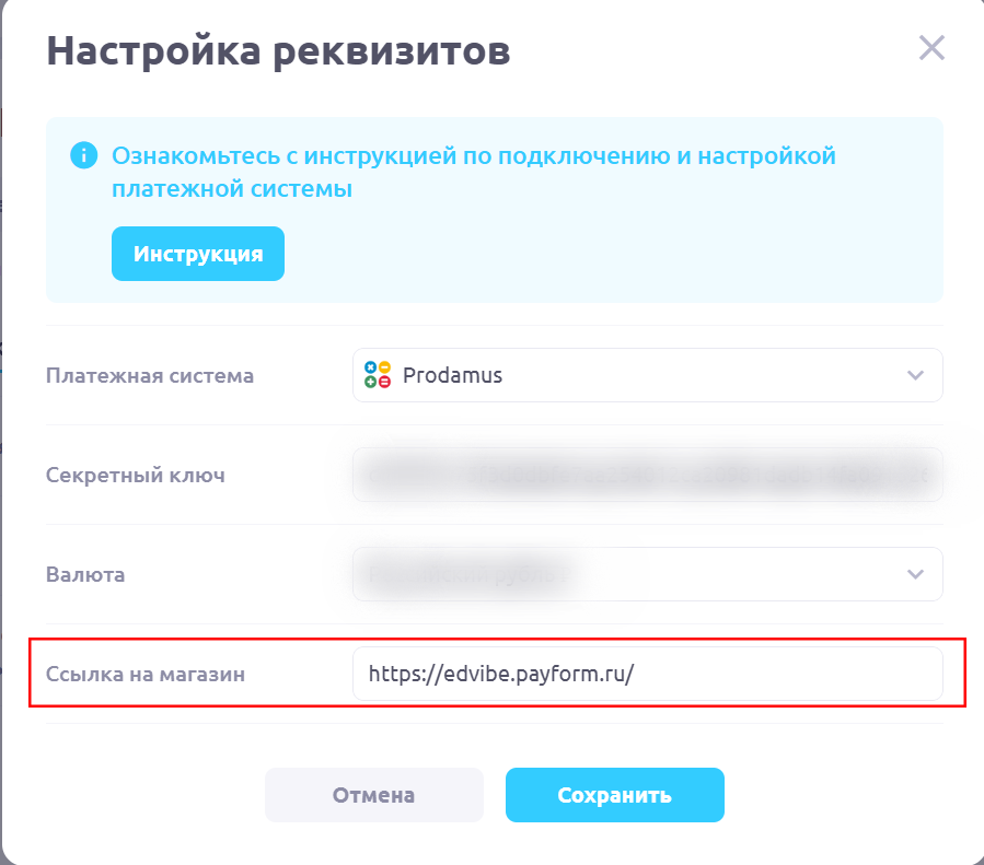 Ссылку на магазин, которую необходимо вставить на Платформе в разделе Прием Платежей, вы можете взять из адресной открыв ваш магазин Prodamus.