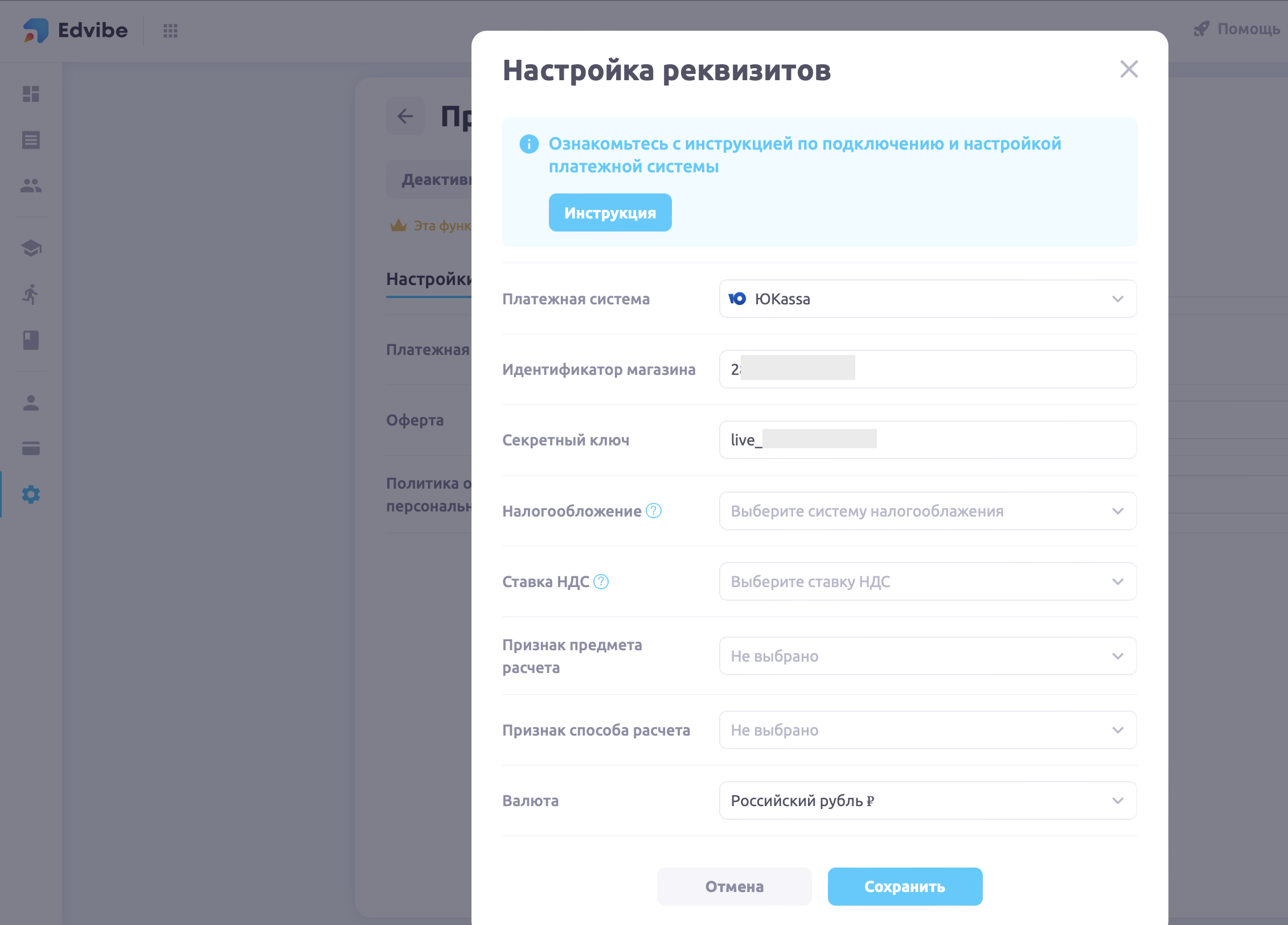 Выберите ЮKassa, вставьте ключ и идентификатор магазина в соответствующие поля в окне настройки платежной системы. Нажмите «Сохранить».