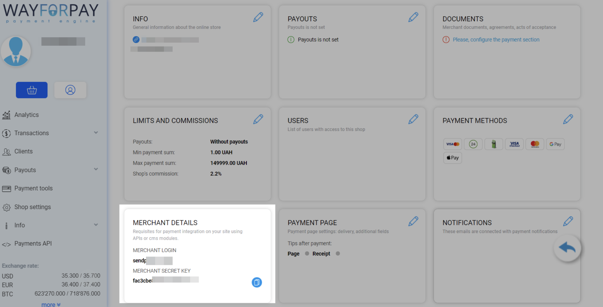 Чтобы настроить обработку платежей через WayForPay, перейдите в настройки магазина, выберите ваш магазин и прокрутите вниз до раздела «Детали мерчанта». Скопируйте значения из полей «Логин мерчанта» и «Секретный ключ мерчанта».