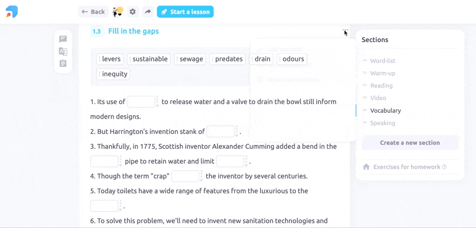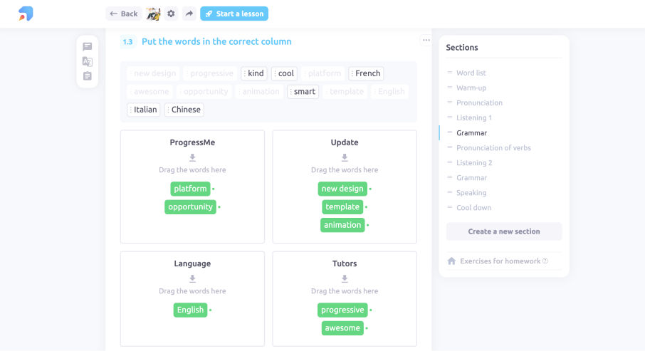 In the “Fill in the gaps from the box”, “Match words and pictures”, and “Sort by column” templates, word boxes will go with you when you scroll. And now you can also fill in the gaps by clicking, not only dragging.